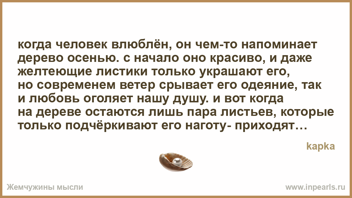 когда человек влюблён, он чем-то напоминает дерево осенью. с начало оно красиво, и даже желтеющие листики только украшают его, но современем ветер срывает его одеяние, так и любовь оголяет нашу душу. и вот когда на дереве остаются лишь пара листьев, которые только подчёркивают его наготу- приходят морозы.