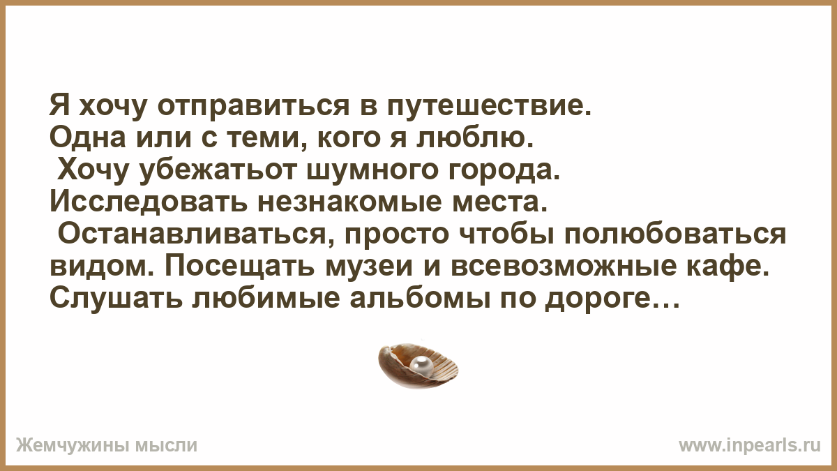 Я хочу отправиться в путешествие. Одна или с теми, кого я люблю. Хочу убежатьот шумного города. Исследовать незнакомые места. Останавливаться, просто чтобы полюбоваться видом. Посещать музеи и всевозможные кафе. Слушать любимые альбомы по дороге. Делать красивые фотографии восхода солнца и летящих облаков. Фотографировать себя. Бегать через лес по росной траве. Гнаться за туманом и солнцем. Тратить часы на поле, чтобы сделать венок из цветов. Чувствовать ветер в волосах. Покупать сувениры. Встречать людей. Наблюдать. Я хочу создавать воспоминания!