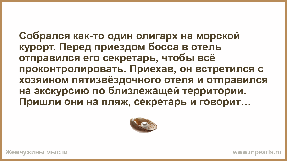 Собрался как-то один олигарх на морской курорт. Перед приездом босса в отель отправился его секретарь, чтобы всё проконтролировать. Приехав, он встретился с хозяином пятизвёздочного отеля и отправился на экскурсию по близлежащей территории. Пришли они на пляж, секретарь и говорит: