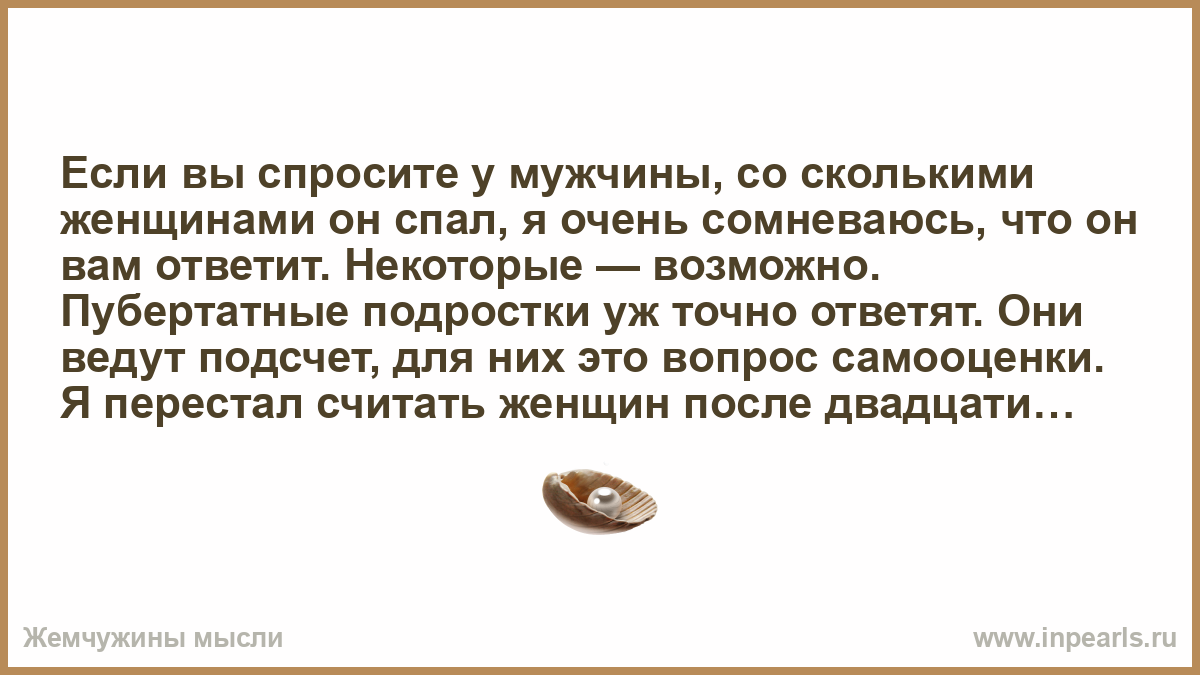 Если вы спросите у мужчины, со сколькими женщинами он спал, я очень сомневаюсь, что он вам ответит. Некоторые — возможно. Пубертатные подростки уж точно ответят. Они ведут подсчет, для них это вопрос самооценки. Я перестал считать женщин после двадцати.