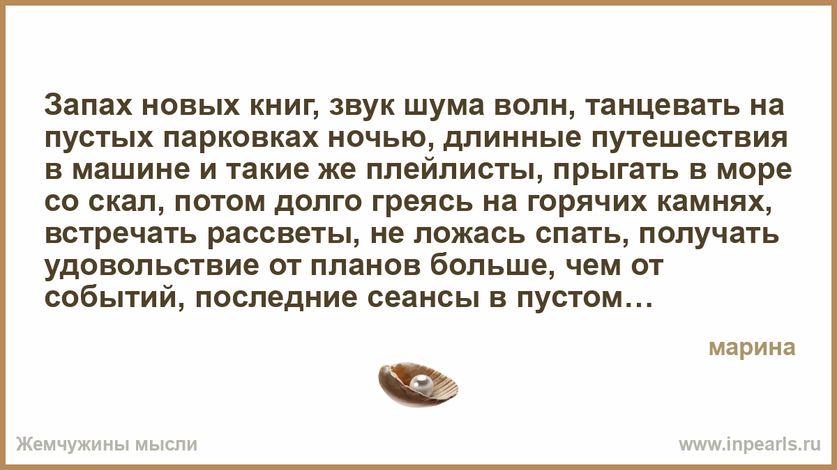 Запах новых книг, звук шума волн, танцевать на пустых парковках ночью, длинные путешествия в машине и такие же плейлисты, прыгать в море со скал, потом долго греясь на горячих камнях, встречать рассветы, не ложась спать, получать удовольствие от планов больше, чем от событий, последние сеансы в пустом кинотеатре, где вы только вдвоем, заслушивать песню до тошноты, сбивать режим, потому что лето и надо все успеть, готовить вместе печенье, целоваться, перемазавшись сахарной пудрой, попадать на концерты молодых исполнителей и независимой музыки, слушать стрекот цикад южной ночью, разглядывать тени от крон деревьев на фоне темного неба, выбирать купальники на лето, отравляя в корзину интернет-магазина, а потом забывать купить, корчить рожицы под водой, пока тебя фотографируют, красить ногти черным, ходить босиком по траве, покупать очередные кеды или кроссовки и радоваться им больше, чем дизайнерским туфлям, кружиться в поле с цветам, падая в изнеможении, и долго смотреть, как ветер играет с стеблями, долгие завтраки с блинчиками или оладьями, есть малину с кустов, срывая ее губами, не прикасаясь пальцами, целоваться до боли в губах…