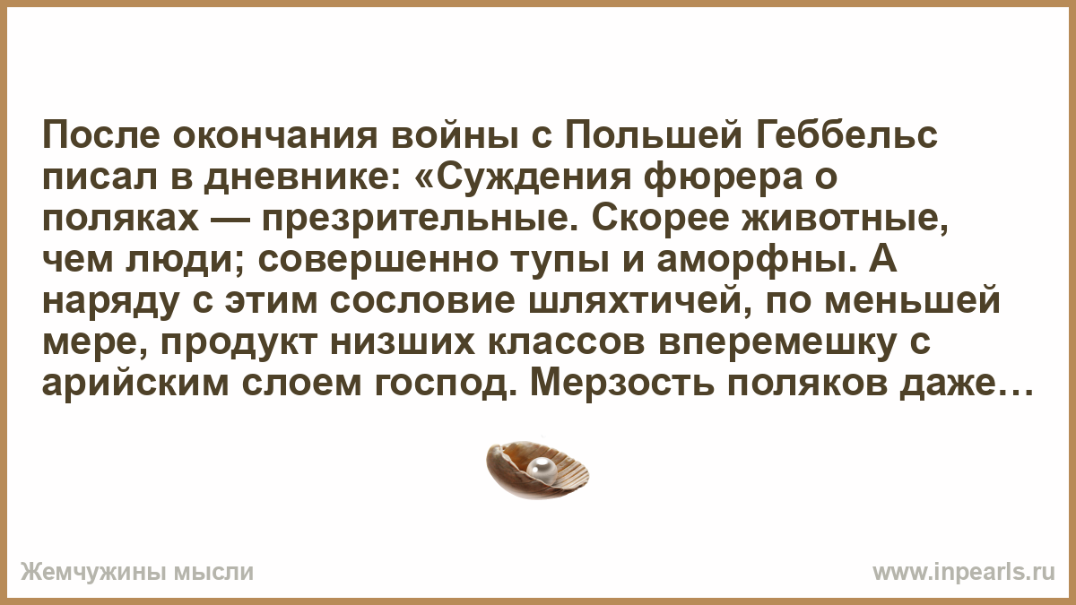 После окончания войны с Польшей Геббельс писал в дневнике: «Суждения фюрера о поляках — презрительные. Скорее животные, чем люди; совершенно тупы и аморфны. А наряду с этим сословие шляхтичей, по меньшей мере, продукт низших классов вперемешку с арийским слоем господ. Мерзость поляков даже и представить себе нельзя. Их способность судить о чем-либо равна нулю».