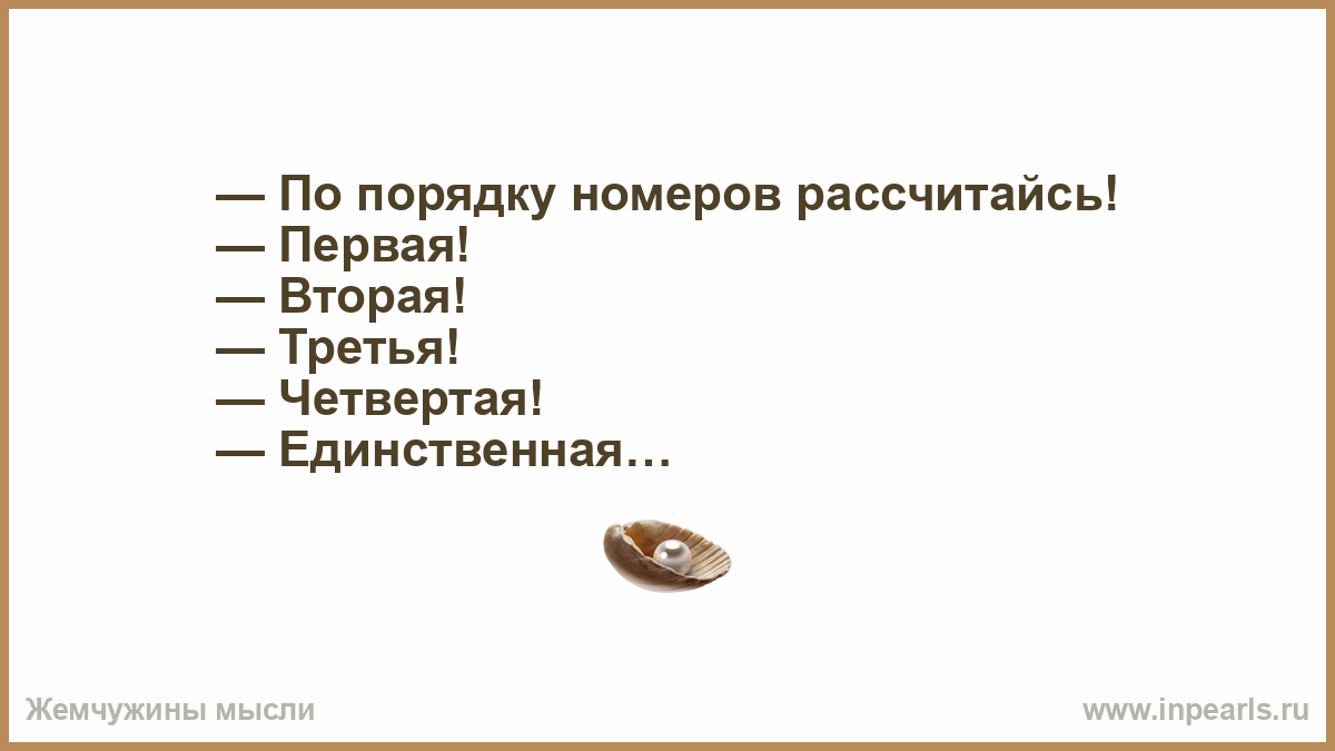 — Расклад такой. Берем мужчин от двадцати до пятидесяти (ей сорок). Отсеиваем женатых. Из оставшихся отсеиваем выпивающих чаще двух раз в месяц. Что, кто-то еще остался? Ну хорошо — из оставшихся отсеиваем тех, кто сидит в автобусе, когда я с сумками стою. Ну, и контрольный отсев — тех, кто, кроме ценников в магазинах, ничего не читает… Еще вопросы будут?