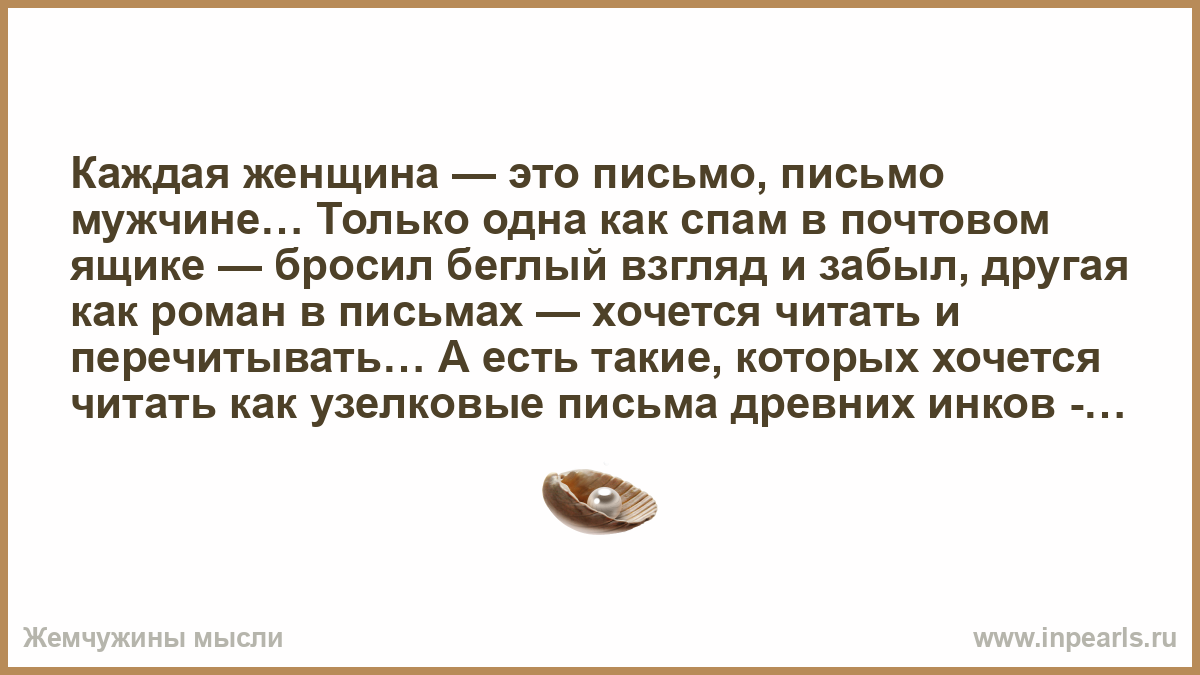 Каждая женщина — это письмо, письмо мужчине… Только одна как спам в почтовом ящике — бросил беглый взгляд и забыл, другая как роман в письмах — хочется читать и перечитывать… А есть такие, которых хочется читать как узелковые письма древних инков -…