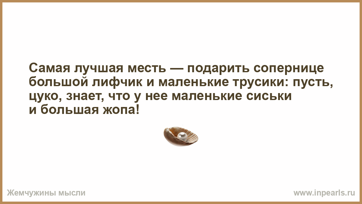 Самая лучшая месть — подарить сопернице большой лифчик и маленькие трусики: пусть, цуко, знает, что у нее маленькие сиськи и большая жопа!