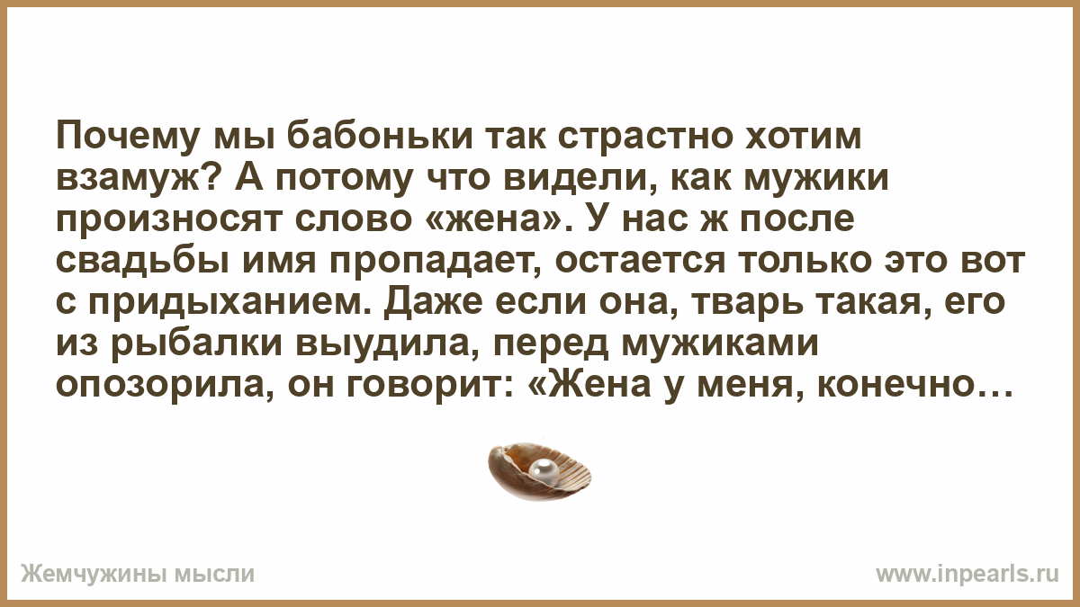 Почему мы бабоньки так страстно хотим взамуж? А потому что видели, как мужики произносят слово «жена». У нас ж после свадьбы имя пропадает, остается только это вот с придыханием. Даже если она, тварь такая, его из рыбалки выудила, перед мужиками опозорила, он говорит: «Жена у меня, конечно, дрянь», а на слове «жена» у него глаз теплеет, на мужиков это слово действует крепче, чем любой аргумент. Или заводит муж себе полюбовницу хорошую, гладкую, с характером вежливым. А он ей: «Пойду уже, меня жена ждёт», от слова этого волшебного молодуху крючит как чёрта от святой воды и сделать-то ничего не может, гладкость сразу шершавится. А зачем мужику чужая шершавость, у него своя дома есть, родная. Или на работу к нему прискакала с бешеными глазюками, и никто не посмеет сказать, что сумасшедшая, произнесут с пониманием: «Петра Семёныча жена!» Или вот до приступа сердечного доведёт. Кого в палату пустят? Ну уж точно не любовницу-паршивку, а жену законную, любящую.