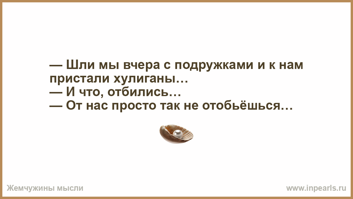 — Шли мы вчера с подружками и к нам пристали хулиганы… — И что, отбились… — От нас просто так не отобьёшься…