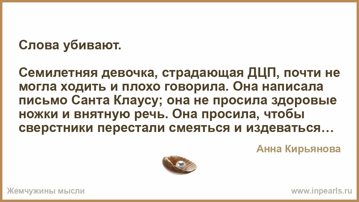 Семилетняя девочка, страдающая ДЦП, почти не могла ходить и плохо говорила. Она написала письмо Санта Клаусу; она не просила здоровые ножки и внятную речь. Она просила, чтобы сверстники перестали смеяться и издеваться над ней. И это душераздирающее письмо: слова ранят и мучают сильнее, чем болезнь. И не надо говорить нам: ах, это всего лишь слова! Подумаешь! Это яд и погибель. И люди, которые говорят дурное — погибельные люди, так их в старину и называли. И они преотлично понимают, что делают. И заранее готовят оправдание ударам: я всего лишь пошутил! Я просто сказал правду! Все они понимают. И надо погибельных людей попросить удалиться немедленно. Или изобличить их подлые замыслы. Спросить: зачем вы мне это говорите? Мне это неприятно. И вы прекрасно это понимаете. И большинство тех, кто попал в больницу, в аварию, впал в депрессию или утратил нечто ценное — они повстречались с погибельными людьми. И не нашли сил уйти или ответить. И если есть Санта Клаус — пусть соберет в мешок погибельных людей с их ядовитыми словами, и унесет в темный лес. Кстати, в старину мешок служил именно для этого. А добрые люди пусть слышат только добрые слова. И выздоравливают, если больны. И никогда не болеют. И получают то, что им жизненно-нужно.
