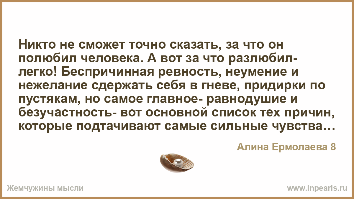 Никто не сможет точно сказать, за что он полюбил человека. А вот за что разлюбил- легко! Беспричинная ревность, неумение и нежелание сдержать себя в гневе, придирки по пустякам, но самое главное- равнодушие и безучастность- вот основной список тех причин, которые подтачивают самые сильные чувства, постепенно разрушая их до основания. Влюбляемся мы быстро, очаровываемся сразу, а вот на разочарование уходит время. Никто не может разлюбить на щелчок пальцев- это постараться надо, чтобы вытравить из любящего сердца всё самое хорошее и светлое, что человек к тебе когда-то испытывал. Поэтому не надо удивляться, что уходит любовь, обвиняя другого человека и обстоятельства, когда ты сам всё для этого сделал.