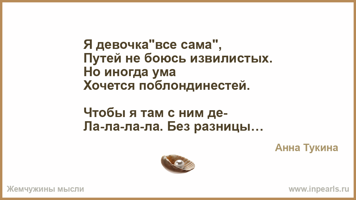 Никого не зову, никого не гоню. Все кто рядом — моя награда. Я научена жизнью печаль свою оставлять на листе тетрадном. Помнить только добро, не затаивать зла, все обиды пускать по ветру… И не верить людям, скупым на дела, а на слово красивое — щедрым.