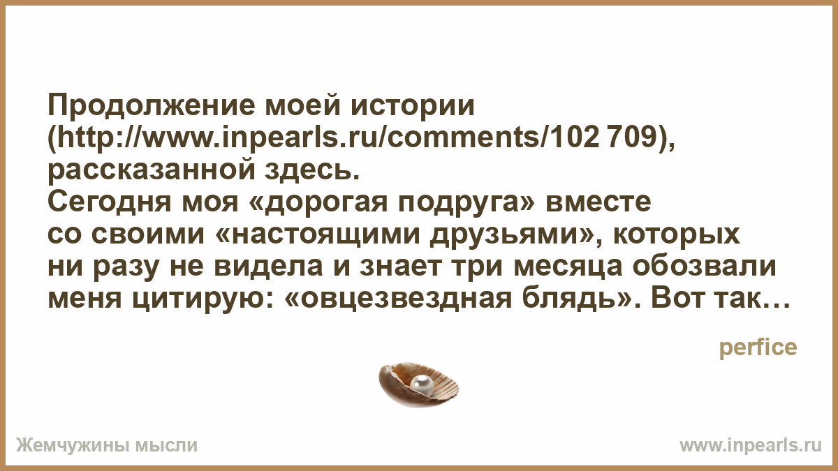 Сегодня моя «дорогая подруга» вместе со своими «настоящими друзьями», которых ни разу не видела и знает три месяца обозвали меня цитирую: «овцезвездная блядь». Вот так вот. За глаза, конечно же.