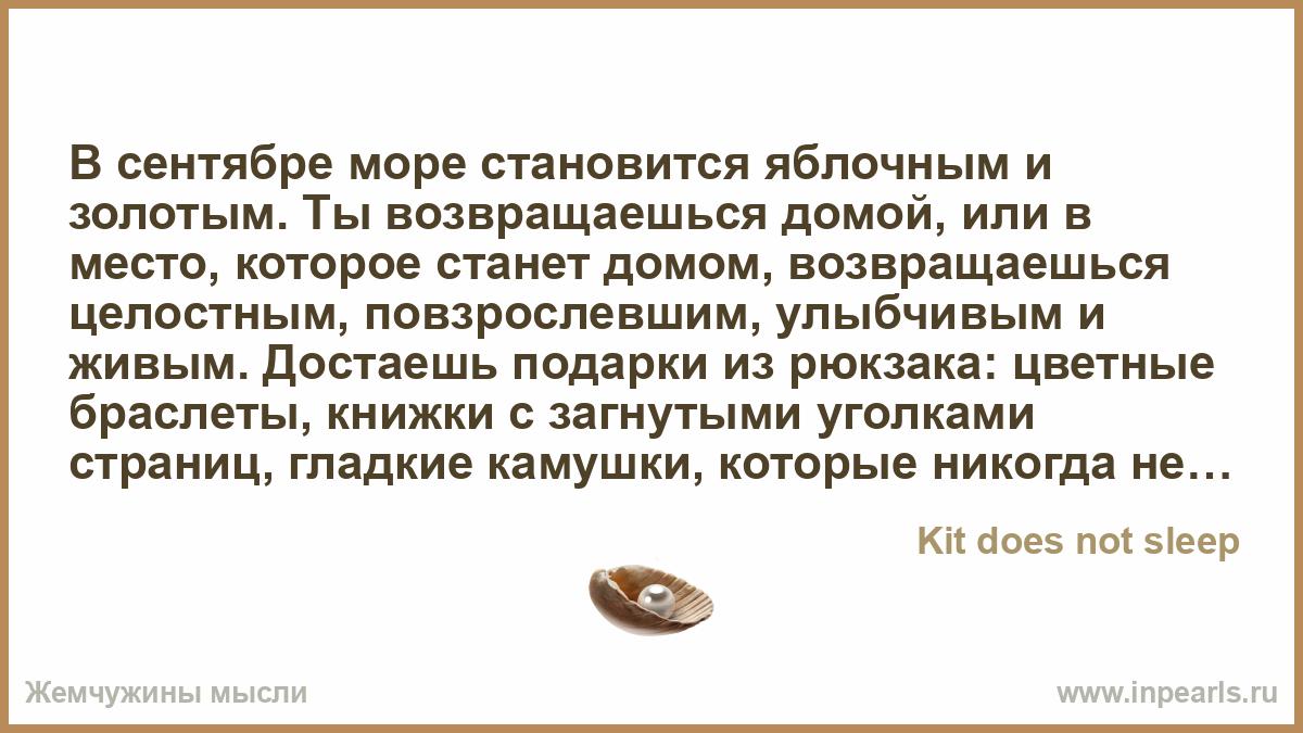 В сентябре море становится яблочным и золотым. Ты возвращаешься домой, или в место, которое станет домом, возвращаешься целостным, повзрослевшим, улыбчивым и живым. Достаешь подарки из рюкзака: цветные браслеты, книжки с загнутыми уголками страниц, гладкие камушки, которые никогда не теряют свое тепло.
