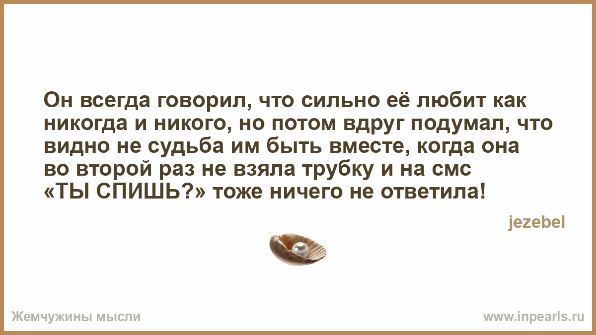 Он всегда говорил, что сильно её любит как никогда и никого, но потом вдруг подумал, что видно не судьба им быть вместе, когда она во второй раз не взяла трубку и на смс «ТЫ СПИШЬ?» тоже ничего не ответила!