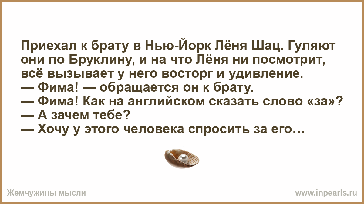 Приехал к брату в Нью-Йорк Лёня Шац. Гуляют они по Бруклину, и на что Лёня ни посмотрит, всё вызывает у него восторг и удивление.