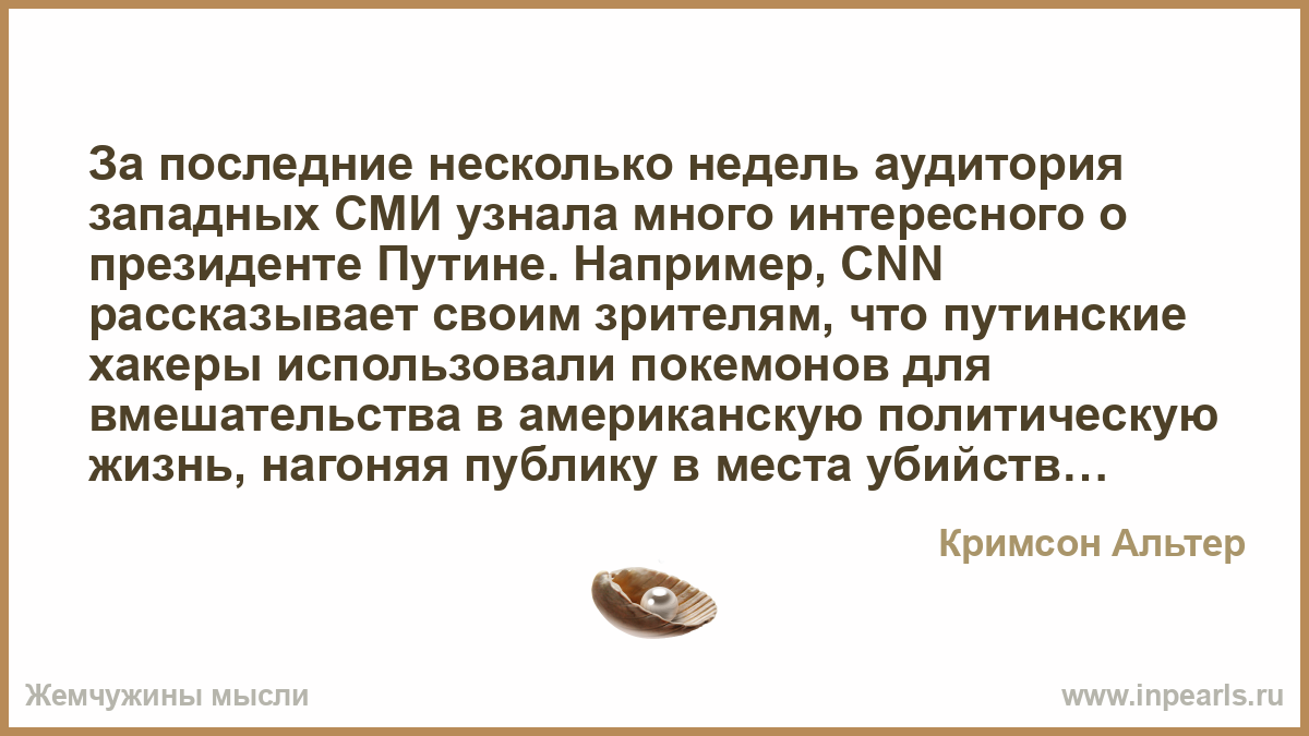 За последние несколько недель аудитория западных СМИ узнала много интересного о президенте Путине. Например, CNN рассказывает своим зрителям, что путинские хакеры использовали покемонов для вмешательства в американскую политическую жизнь, нагоняя публику в места убийств чернокожих полицейскими.