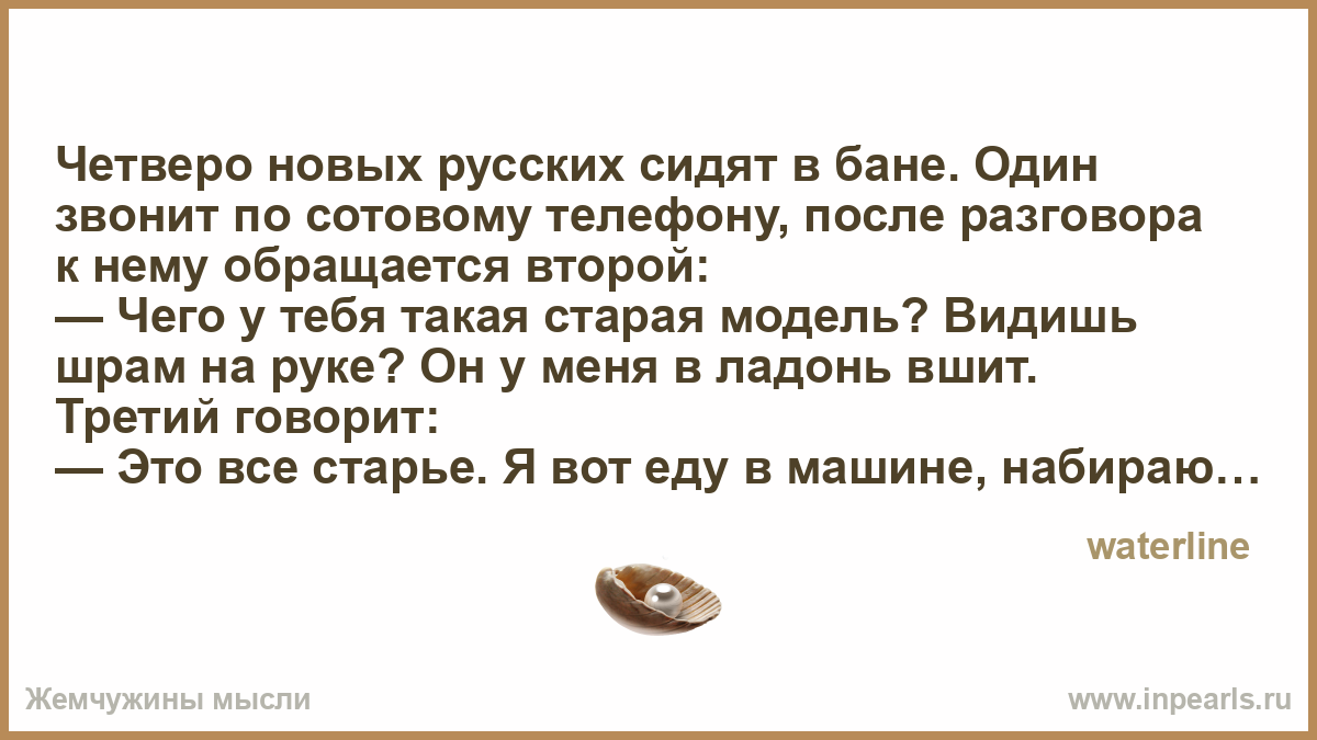Четверо новых русских сидят в бане. Один звонит по сотовому телефону, после разговора к нему обращается второй: