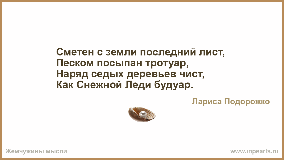 Сметен с земли последний лист, Песком посыпан тротуар, Наряд седых деревьев чист, Как Снежной Леди будуар.
