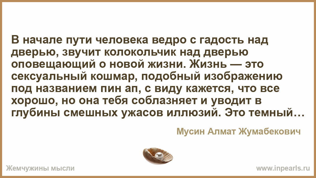 В начале пути человека ведро с гадость над дверью, звучит колокольчик над дверью оповещающий о новой жизни. Жизнь — это сексуальный кошмар, подобный изображению под названием пин ап, с виду кажется, что все хорошо, но она тебя соблазняет и уводит в глубины смешных ужасов иллюзий. Это темный лабиринт, из комнат и коридоров системы общества, звучит жуткая музыка из поющих бокалов, мигает свет повсюду, там призраки в зеркалах, самовлюбленные находящиеся в зазеркалье самолюбия, руки скребущиеся по зеркалу, стоны, они пытаются выбраться наружу, в реальность, там пробегают призраки тени, потерянные души в собственном эгоизме, заблудившиеся в собственной лжи, лунатики с абсолютно белыми глазами глядящие в окно в пустоту собственной правды, и где-то одержимые бесами, с черными на весь глаз глазами, одержимые эгоизмом, у некоторых левитация спящих во время сна, те у которых кома самообмана, некоторые смотрят телевизор, компьютер, и прочие виды гаджетов вроде айфонов, и айпадов, но они выключены, в телевизоре сломаны каналы, но они как зомби смотрят в пустоту и утверждают что видят что-то интересное, люди в наушниках слышат шум и почему-то странно танцуют, там есть освещение совести во мраке в виде новогодних огоньков как символ надежды, следуй за огоньками.