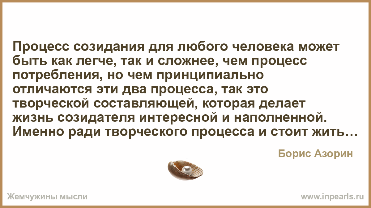 Процесс созидания для любого человека может быть как легче, так и сложнее, чем процесс потребления, но чем принципиально отличаются эти два процесса, так это творческой составляющей, которая делает жизнь созидателя интересной и наполненной. Именно ради творческого процесса и стоит жить не потреблением, а созиданием, оно всегда приносит душевное наслаждение. Творчество — это свобода и возможности для созидателя, но всегда обуза и скука для потребителя, так как для него гораздо интереснее, так как легче, просто потреблять. А это в свою очередь означает равнозначность состояний как потребления, так и созидания — это не плохо и не хорошо, это является всего лишь личным выбором человека, его индивидуальным предпочтением или удобным лично для него способом жить.