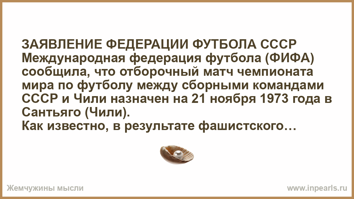 Федерация футбола СССР от имени советских спортсменоз выражает решительный протест и заявляет, что в сложившейся обстановке, когда Международная федерация футбола вопреки, здравому смыслу пошла на поводу у чилийской реакции, она вынуждена отказаться от участия в отборочной игре чемпионата мира на территории Чили и возлагает всю ответственность за это на руководителей ФИФА.