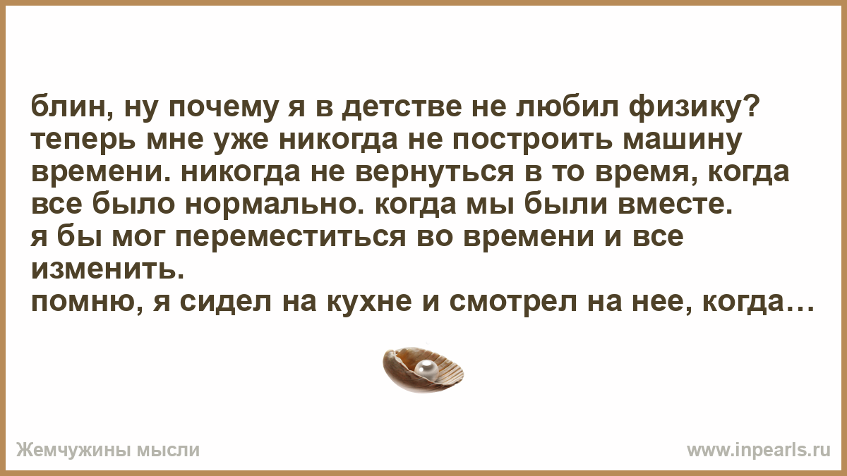 блин, ну почему я в детстве не любил физику? теперь мне уже никогда не построить машину времени. никогда не вернуться в то время, когда все было нормально. когда мы были вместе.