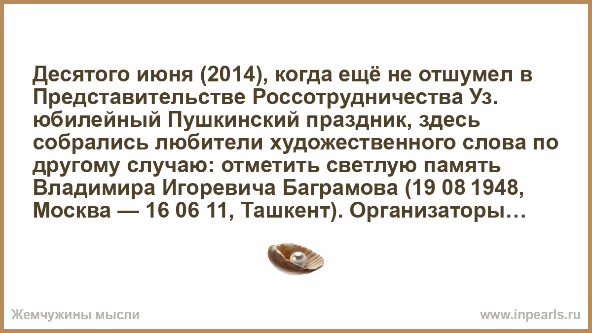 Десятого июня (2014), когда ещё не отшумел в Представительстве Россотрудничества Уз. юбилейный Пушкинский праздник, здесь собрались любители художественного слова по другому случаю: отметить светлую память Владимира Игоревича Баграмова (19 08 1948, Москва — 16 06 11, Ташкент). Организаторы музыкально-поэтического вечера — Арт-студия «Анхор» и Клуб авторской песни «Арча» сделали всё, чтобы донести до многочисленных слушателей многогранное творчество автора-исполнителя, писателя, поэта — в стихах и его авторских песнях, а также стихотворных посвящениях и воспоминаниях друзей.