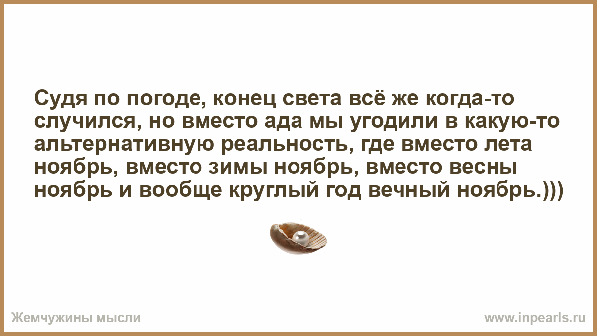 Судя по погоде, конец света всё же когда-то случился, но вместо ада мы угодили в какую-то альтернативную реальность, где вместо лета ноябрь, вместо зимы ноябрь, вместо весны ноябрь и вообще круглый год вечный ноябрь.)))
