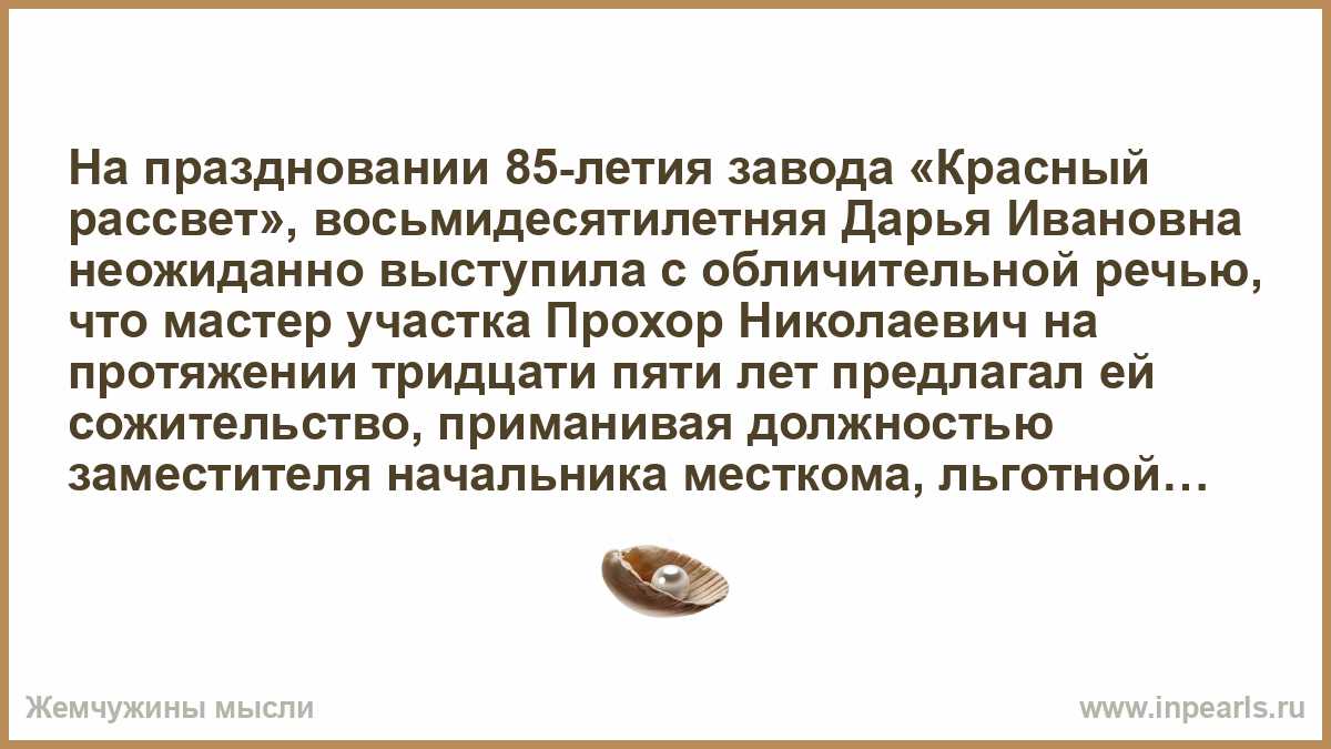 На праздновании 85-летия завода «Красный рассвет», восьмидесятилетняя Дарья Ивановна неожиданно выступила с обличительной речью, что мастер участка Прохор Николаевич на протяжении тридцати пяти лет предлагал ей сожительство, приманивая должностью заместителя начальника месткома, льготной путевкой в Судак и заказом повышенной категории. Тут встали еще пятнадцать женщин и всякое припомнили бывшему начальнику. И угрозы дисциплинарным взысканием, и отпуск в феврале, и отрез на праздник тем, кто не устоял.