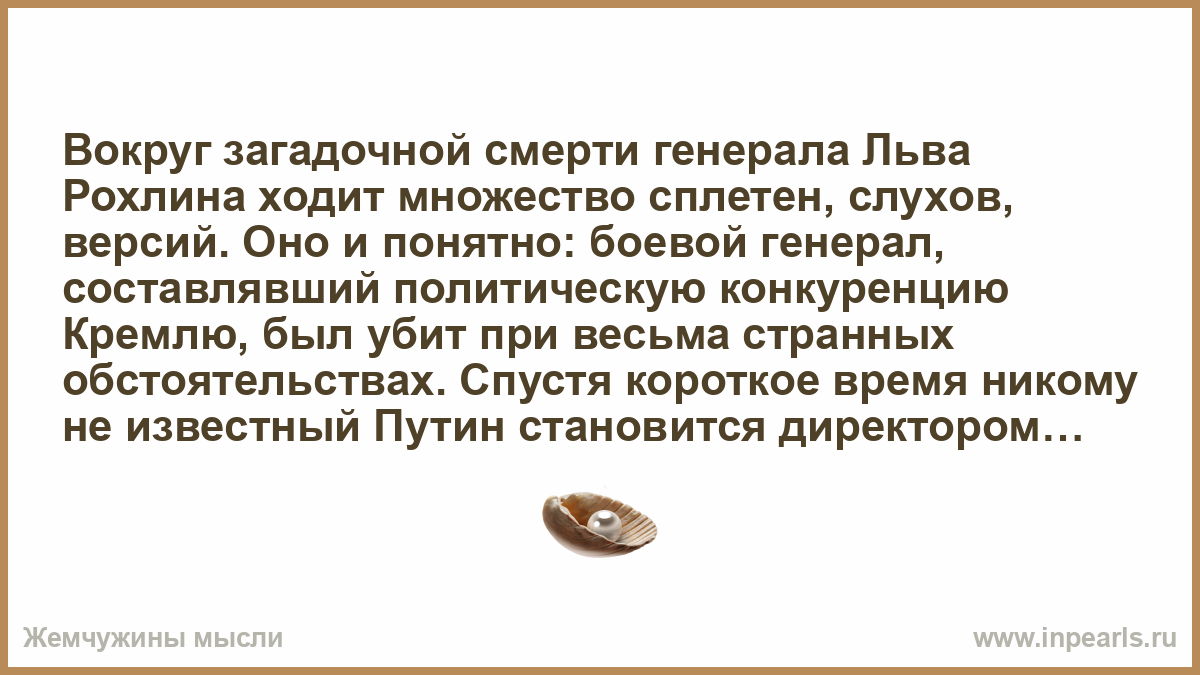 Вокруг загадочной смерти генерала Льва Рохлина ходит множество сплетен, слухов, версий. Оно и понятно: боевой генерал, составлявший политическую конкуренцию Кремлю, был убит при весьма странных обстоятельствах. Спустя короткое время никому не известный Путин становится директором ФСБ, а затем и занимает Кремль. Связаны ли между собой эти события и кто стоит за убийством генерала Льва Рохлина, намеревавшегося отстранить Ельцина от власти? Об этом и пойдёт речь в статье.