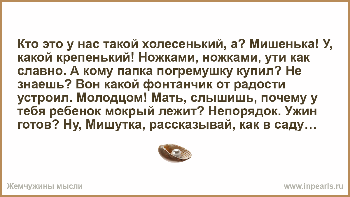 Кто это у нас такой холесенький, а? Мишенька! У, какой крепенький! Ножками, ножками, ути как славно. А кому папка погремушку купил? Не знаешь? Вон какой фонтанчик от радости устроил. Молодцом! Мать, слышишь, почему у тебя ребенок мокрый лежит? Непорядок. Ужин готов? Ну, Мишутка, рассказывай, как в саду. Какие новости? Воспитательница на ежа села? Молодцом! Твоя работа? Смешно. А где ты вареньем куртку загваздал? Мать, что у нас с ребенком? Мы будем его воспитаньем заниматься, или он у нас, как гриб, растет? А ты молчи! Я в твои годы кошке «брысь» говорить стеснялся.