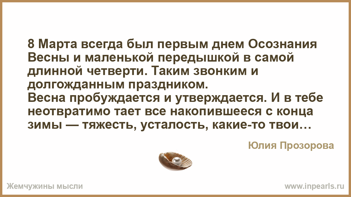 Этот день всегда звучит весенним счастьем. И всякий раз, как на подходе праздник — он пахнет тем временем, и одновременно чем-то новым и обещающим. Ждешь подарка от дочери и понимаешь, что ничто никуда не девается. Все только растет, только защищает. Возможно не от всего — но от многого точно.