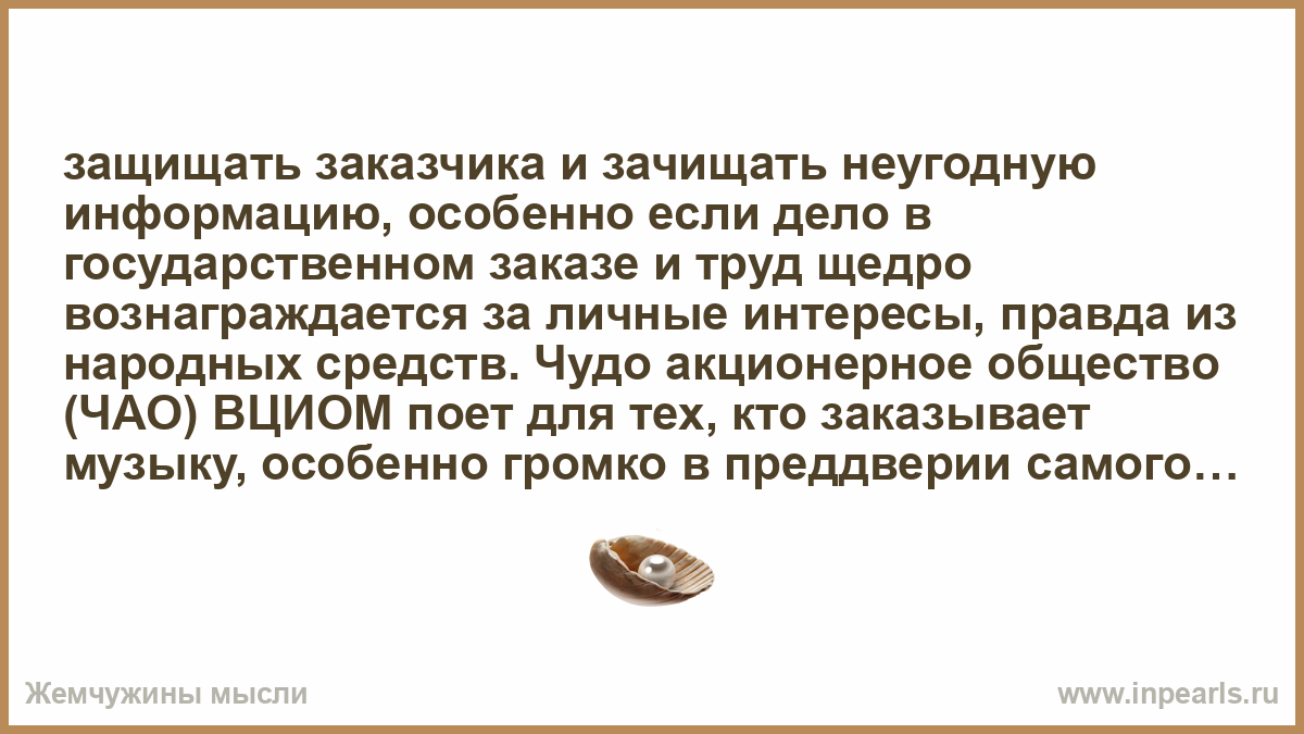 защищать заказчика и зачищать неугодную информацию, особенно если дело в государственном заказе и труд щедро вознаграждается за личные интересы, правда из народных средств. Чудо акционерное общество (ЧАО) ВЦИОМ поет для тех, кто заказывает музыку, особенно громко в преддверии самого важного события — выборы самого главного заказчика или цена устраивает. Чудо цифры, магические мантры не стираются с экранов аффилированных зомбитв, аффилированными чудотворцами провозглашаются заклинания, повторяя из раза в раз, их правда и только правда, клятва перед лицом заветного счета, что иным рассчитывать на другое просто не на что, ставка запредельная.