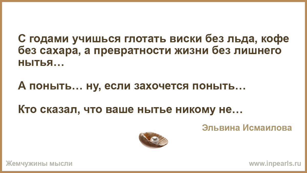 С годами учишься глотать виски без льда, кофе без сахара, а превратности жизни без лишнего нытья…