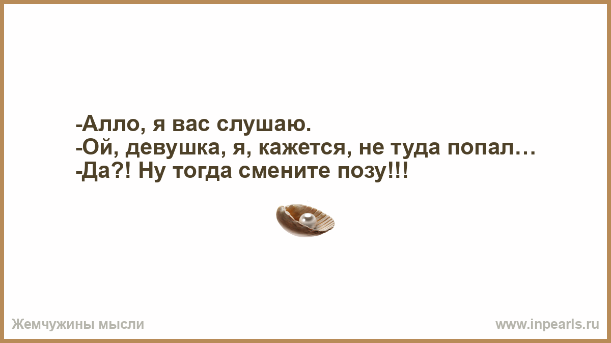 -Алло, я вас слушаю. -Ой, девушка, я, кажется, не туда попал… -Да?! Ну тогда смените позу!!!