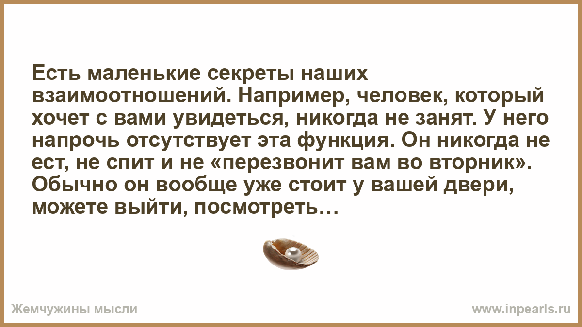 Есть маленькие секреты наших взаимоотношений. Например, человек, который хочет с вами увидеться, никогда не занят. У него напрочь отсутствует эта функция. Он никогда не ест, не спит и не «перезвонит вам во вторник». Обычно он вообще уже стоит у вашей двери, можете выйти, посмотреть.
