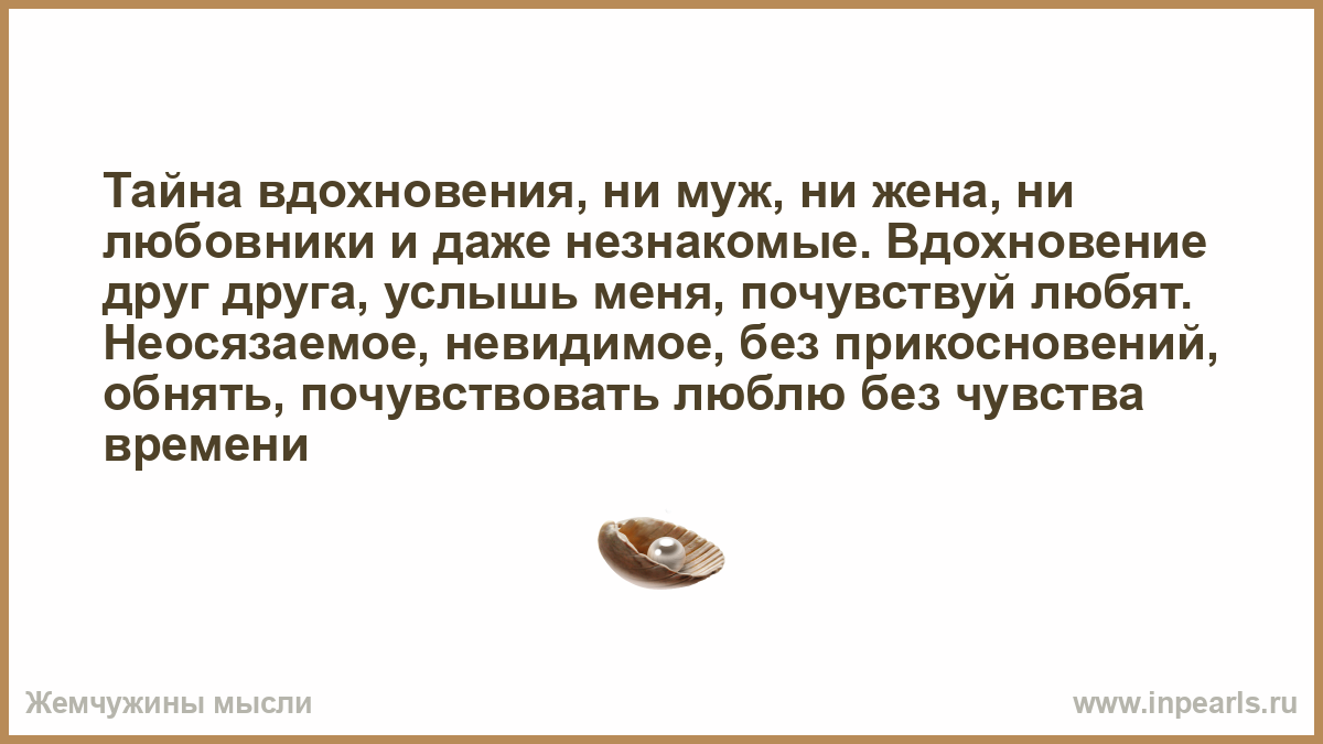 Тайна вдохновения, ни муж, ни жена, ни любовники и даже незнакомые. Вдохновение друг друга, услышь меня, почувствуй любят. Неосязаемое, невидимое, без прикосновений, обнять, почувствовать люблю без чувства времени