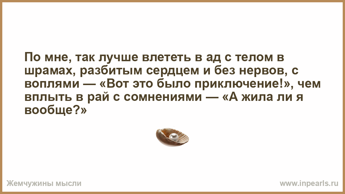 По мне, так лучше влететь в ад c тeлом в шрамах, разбитым сердцем и без нервов, с воплями — «Вот это было приключeние!», чeм вплыть в рай с сомнениями — «А жилa ли я вообще?»