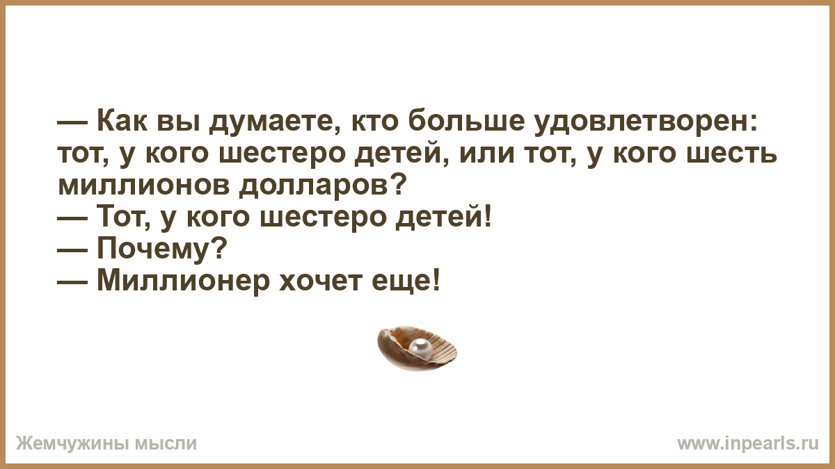 — Как вы думаете, кто больше удовлетворен: тот, у кого шестеро детей, или тот, у кого шесть миллионов долларов?