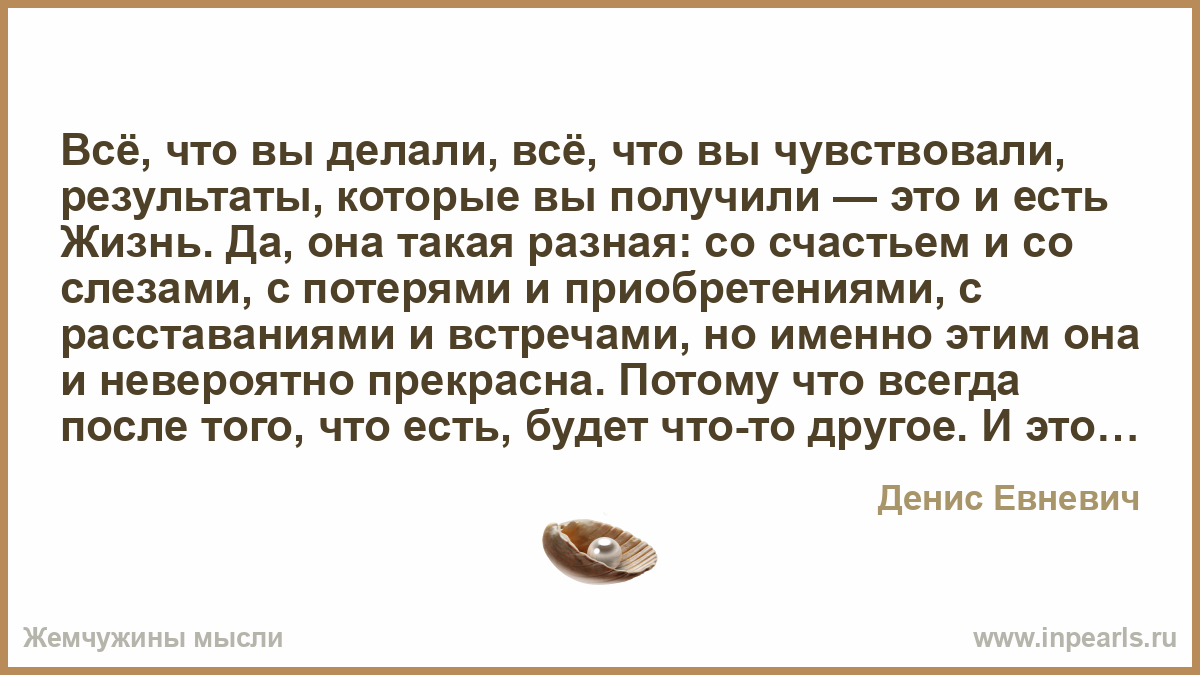 Всё, что вы делали, всё, что вы чувствовали, результаты, которые вы получили — это и есть Жизнь. Да, она такая разная: со счастьем и со слезами, с потерями и приобретениями, с расставаниями и встречами, но именно этим она и невероятно прекрасна. Потому что всегда после того, что есть, будет что-то другое. И это другое зависит от того, как вы чувствуете и воспринимаете Мир, что вы хотите от него и как хотите проявиться в нём.