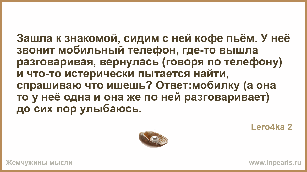 Зашла к знакомой, сидим с ней кофе пьём. У неё звонит мобильный телефон, где-то вышла разговаривая, вернулась (говоря по телефону) и что-то истерически пытается найти, спрашиваю что ишешь? Ответ:мобилку (а она то у неё одна и она же по ней разговаривает) до сих пор улыбаюсь.