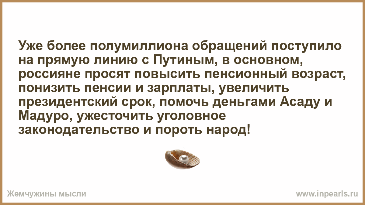 Уже более полумиллиона обращений поступило на прямую линию с Путиным, в основном, россияне просят повысить пенсионный возраст, понизить пенсии и зарплаты, увеличить президентский срок, помочь деньгами Асаду и Мадуро, ужесточить уголовное законодательство и пороть народ!