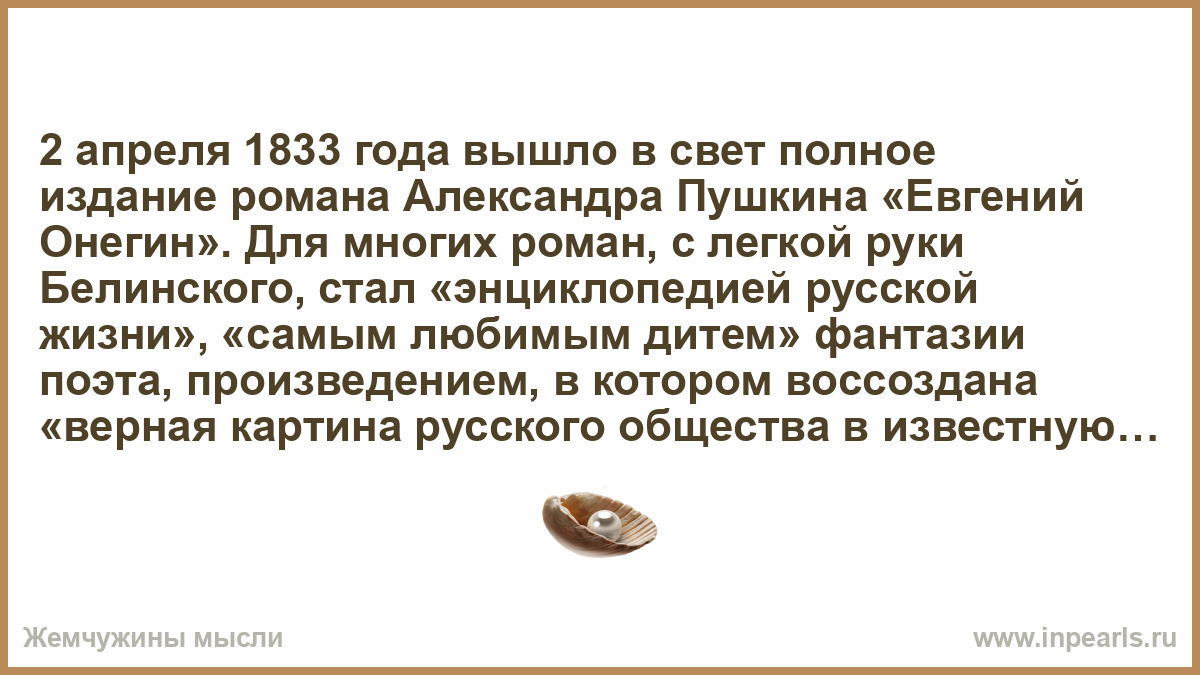 2 апреля 1833 года вышло в свет полное издание романа Александра Пушкина «Евгений Онегин». Для многих роман, с легкой руки Белинского, стал «энциклопедией русской жизни», «самым любимым дитем» фантазии поэта, произведением, в котором воссоздана «верная картина русского общества в известную эпоху». В одну неделю пятитысячный тираж первого издания разошелся целиком. Для того времени это было сенсацией…