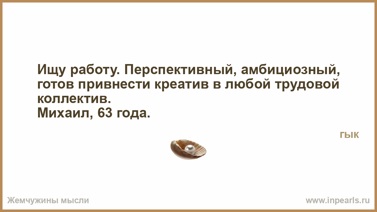 Ищу работу. Перспективный, амбициозный, готов привнести креатив в любой трудовой коллектив. Михаил, 63 года.