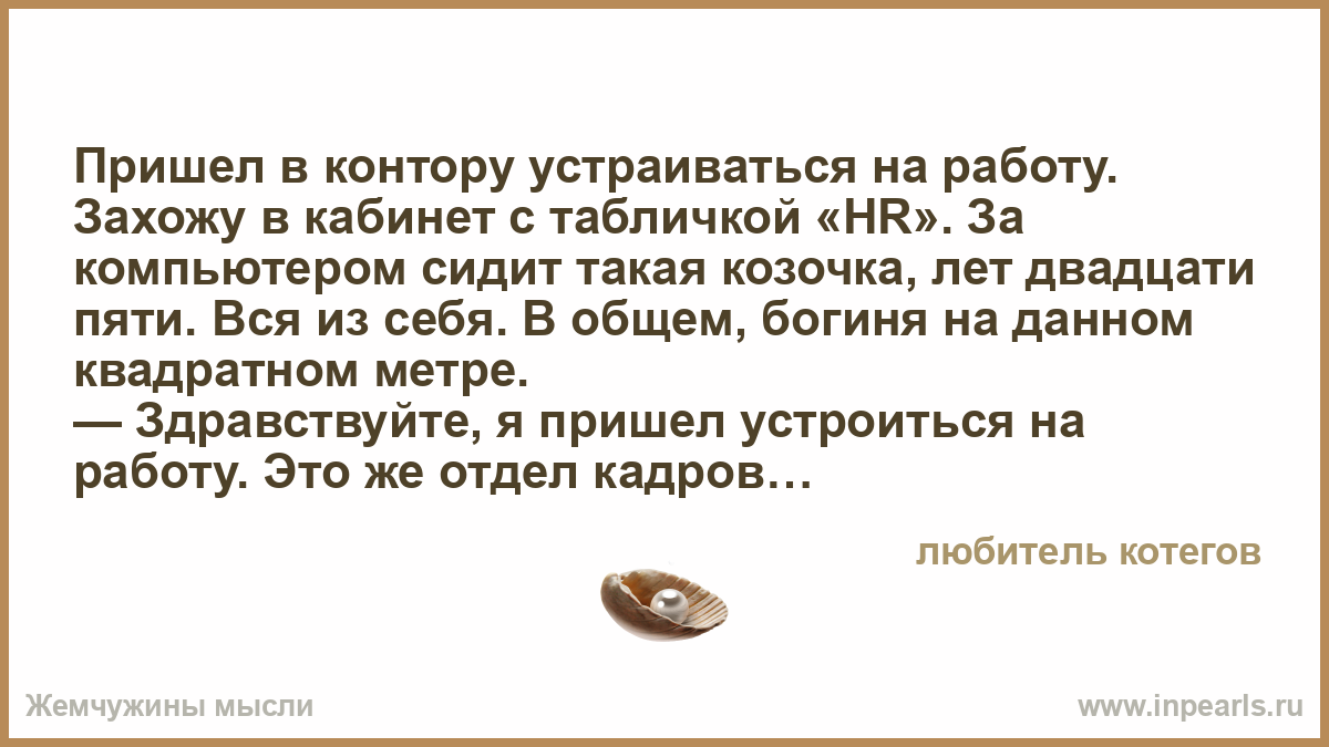 Пришел в контору устраиваться на работу. Захожу в кабинет с табличкой «HR». За компьютером сидит такая козочка, лет двадцати пяти. Вся из себя. В общем, богиня на данном квадратном метре.