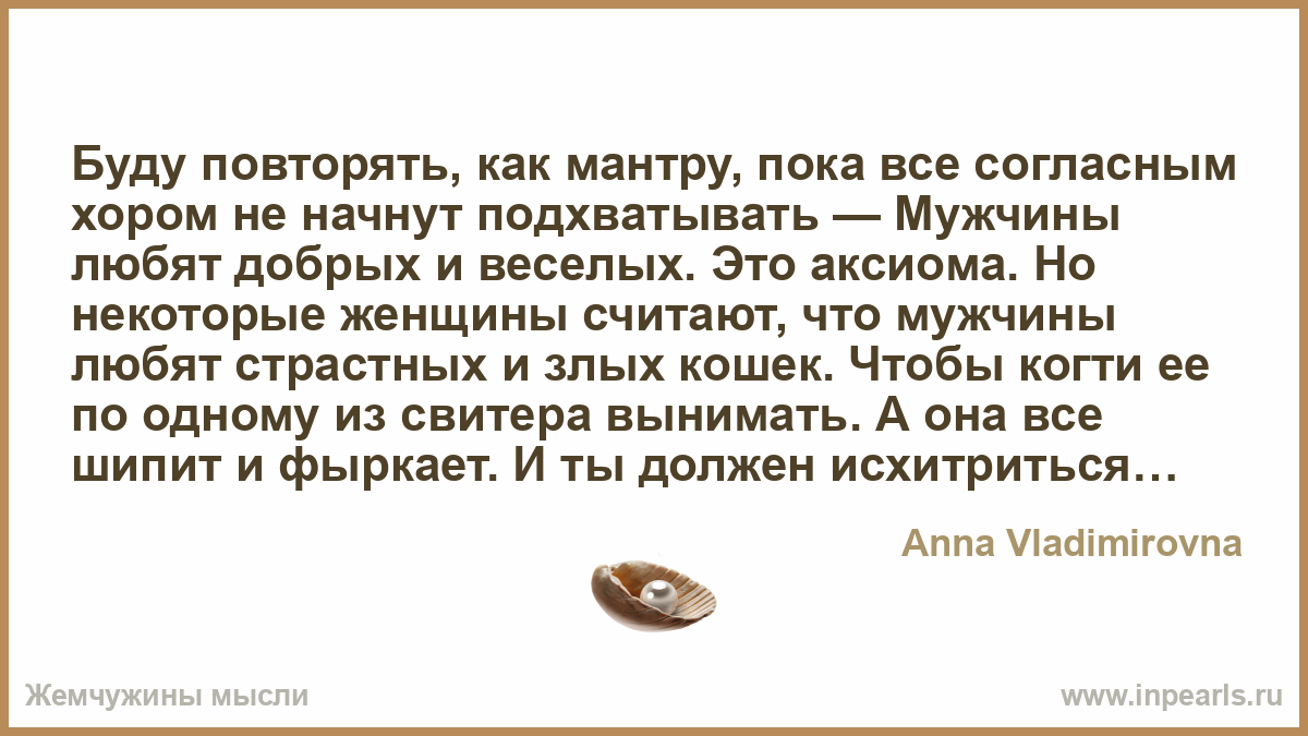 Буду повторять, как мантру, пока все согласным хором не начнут подхватывать — Мужчины любят добрых и веселых. Это аксиома. Но некоторые женщины считают, что мужчины любят страстных и злых кошек. Чтобы когти ее по одному из свитера вынимать. А она все шипит и фыркает. И ты должен исхитриться, ухватить её за шкирку и содрав леопардовые лосины… нет, сейчас не об этом.