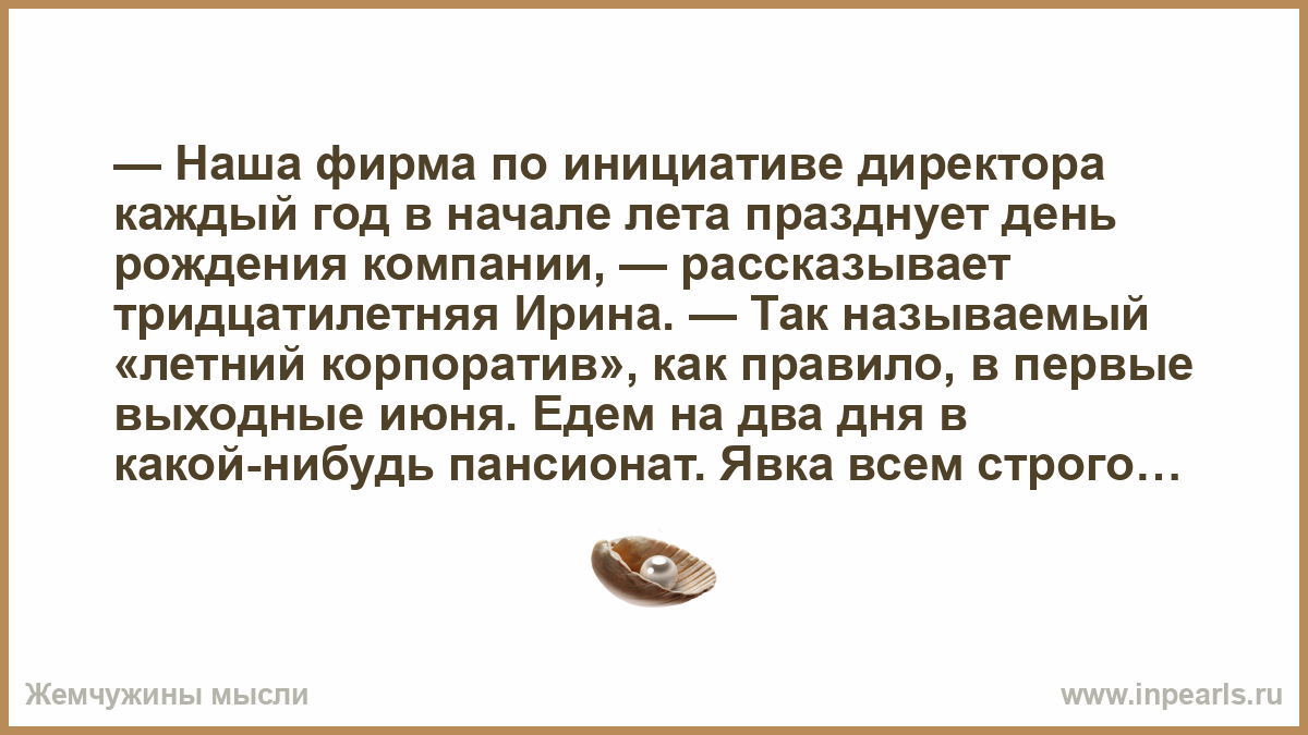 — Наша фирма по инициативе директора каждый год в начале лета празднует день рождения компании, — рассказывает тридцатилетняя Ирина. — Так называемый «летний корпоратив», как правило, в первые выходные июня. Едем на два дня в какой-нибудь пансионат. Явка всем строго обязательна. И без вторых половин!