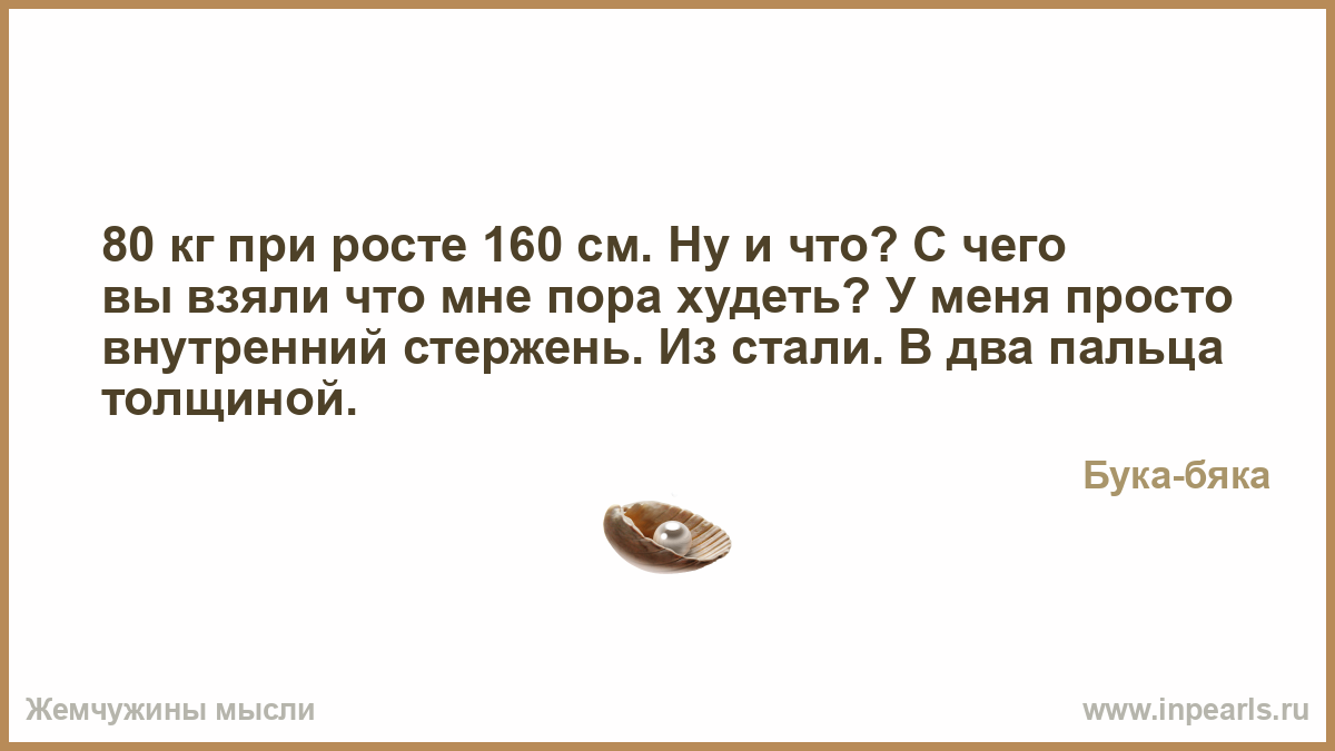 80 кг при росте 160 см. Ну и что? С чего вы взяли что мне пора худеть? У меня просто внутренний стержень. Из стали. В два пальца толщиной.