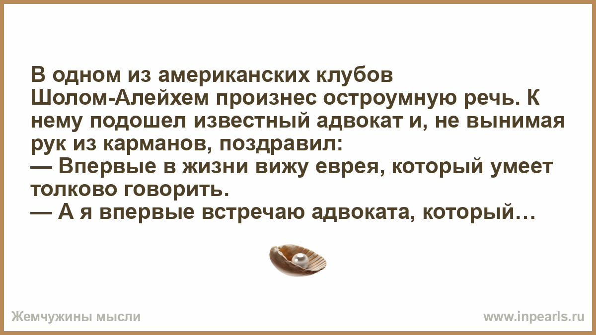 В одном из американских клубов Шолом-Алейхем произнес остроумную речь. К нему подошел известный адвокат и, не вынимая рук из карманов, поздравил: