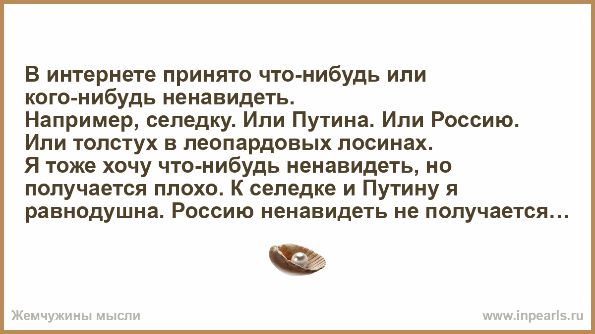 Я тоже хочу что-нибудь ненавидеть, но получается плохо. К селедке и Путину я равнодушна. Россию ненавидеть не получается, как я ни стараюсь — воспитание-с. А толстухи что ж, я сама толстуха.