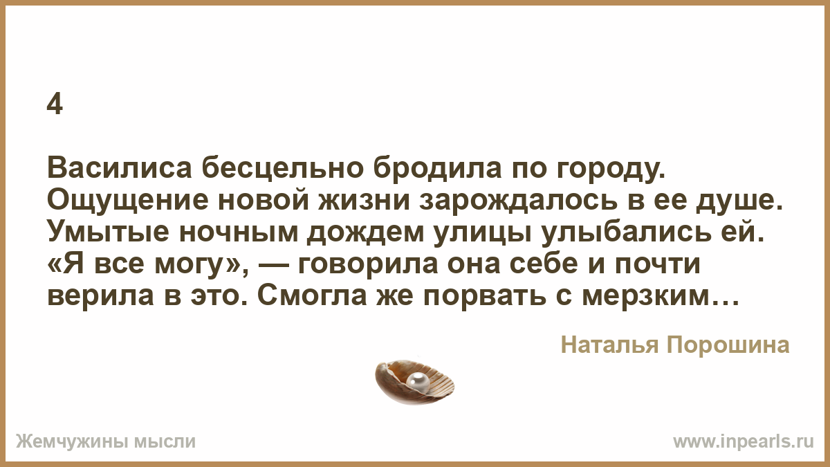 Василиса бесцельно бродила по городу. Ощущение новой жизни зарождалось в ее душе. Умытые ночным дождем улицы улыбались ей. «Я все могу», — говорила она себе и почти верила в это. Смогла же порвать с мерзким прошлым, которое так долго довлело над ней. Прикосновения Игоря были прекрасны, и каждая клеточка ее тела отзывалась на них. Вспомнив его руки, Вася резко остановилась, в животе что-то ухнуло, ноги отказались идти дальше.